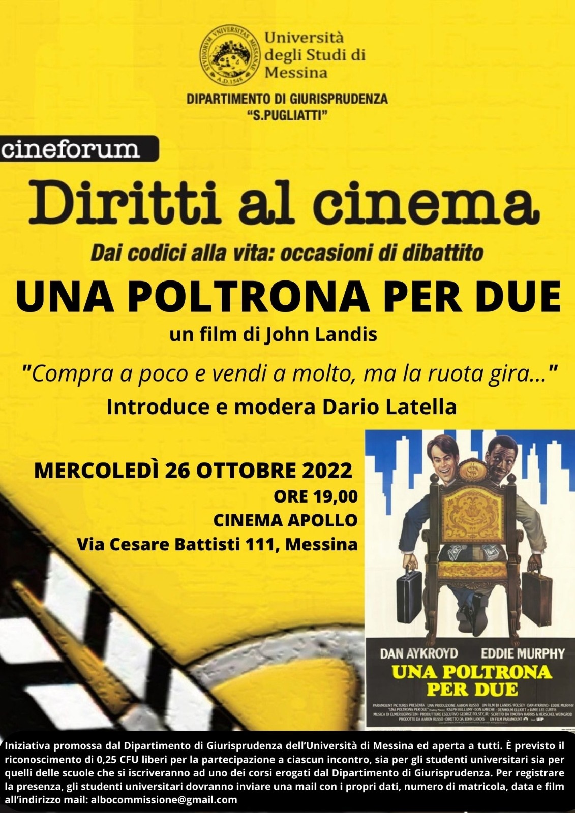 Mercoledì 26 ottobre, alle ore 19, prende il via l'edizione 2022-2023 del Cineforum "Diritti al cinema" organizzato dal Dipartimento di Giurisprudenza. La proiezione di "Una poltrona per due" (di John Landis) avrà luogo al Cinema Apollo, in via Cesare Battisti 111.