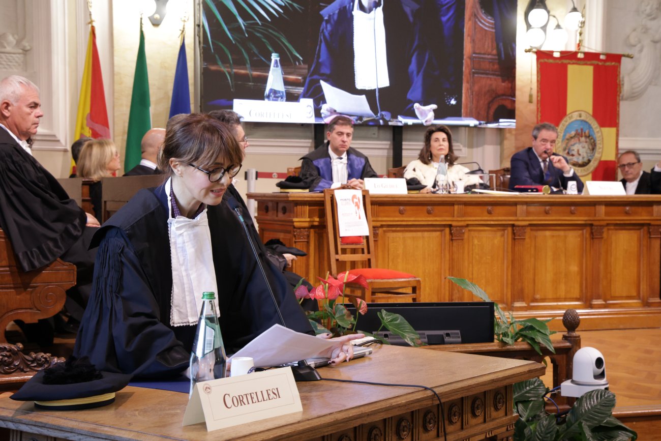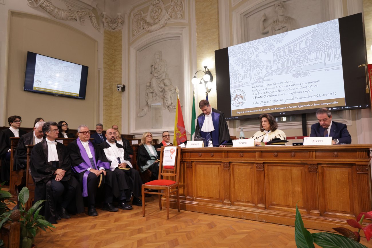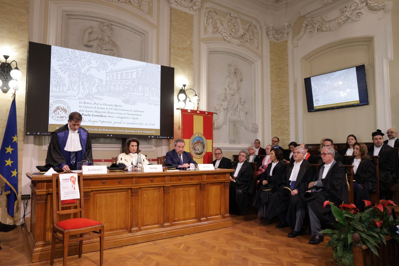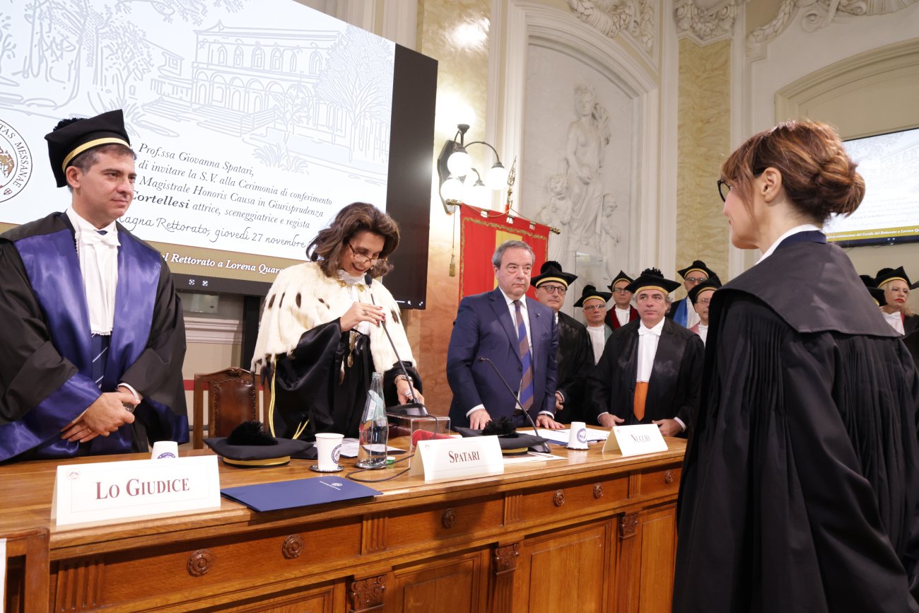 L’Aula Magna del Rettorato ha ospitato la Cerimonia di conferimento della Laurea Magistrale honoris causa in Giurisprudenza all’attrice, sceneggiatrice e regista Paola Cortellesi. Erano presenti la Rettrice, prof.ssa Giovanna Spatari, il Direttore del Dipartimento di Giurisprudenza, prof. Alessio Lo Giudice, a cui è stata affidata la Laudatio, il Direttore generale, dott. Pietro Nuccio, i genitori di Lorena Quaranta e Sara Campanella, numerose autorità civili, militari e religiose.  Subito dopo la Cerimonia, si è svolta anche l’intitolazione del Cortile del Rettorato a Lorena Quaranta e Sara Campanella, due studentesse dell’Ateneo vittime di femminicidio.