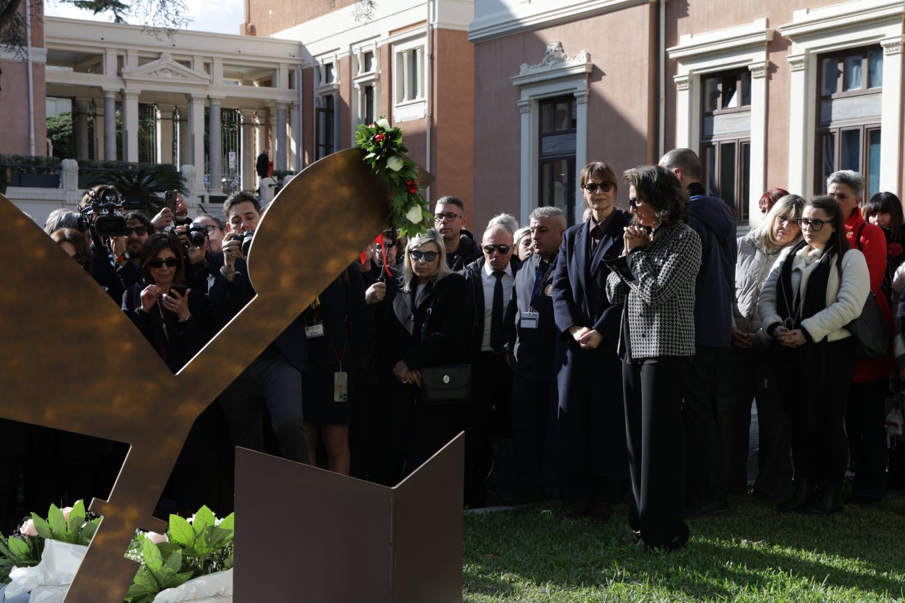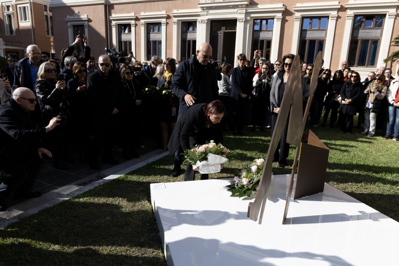 I familiari delle due giovani hanno deposto nei pressi dell'opera dei fiori ed una corona d'alloro.