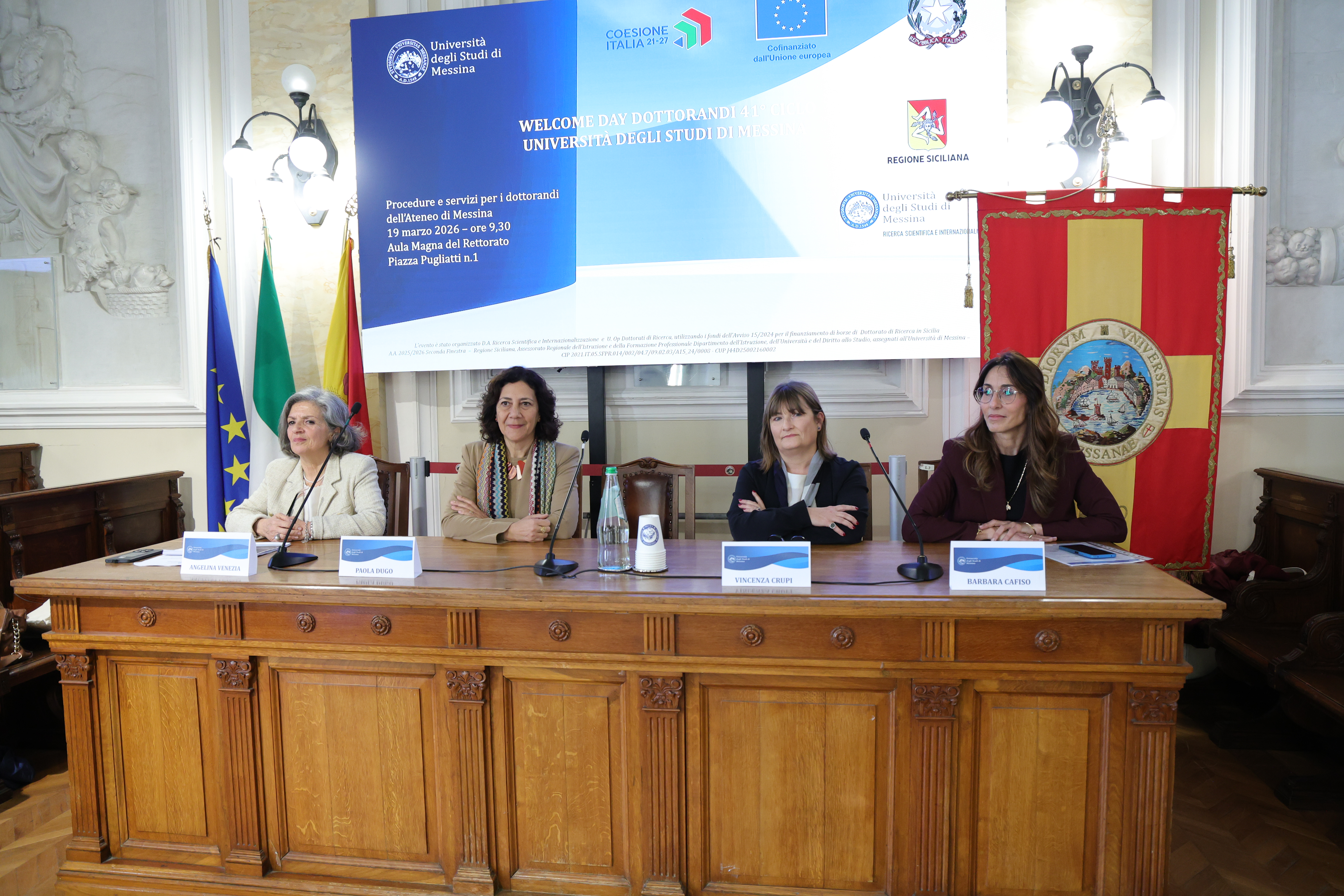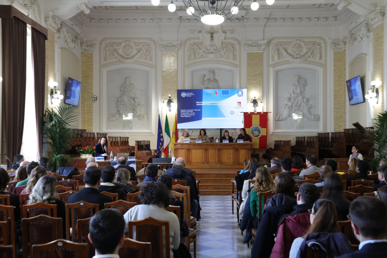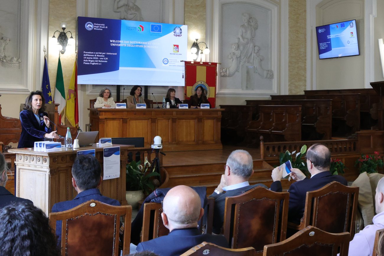 L'Aula Magna del Rettorato ha ospitato il "Welcome Day Dottorandi 41° ciclo - Procedure e servizi per i dottorandi dell'Università degli Studi di Messina", evento realizzato dall'U. Op. Dottorati di Ricerca del D.A. Ricerca Scientifica e Internazionalizzazione, per accogliere gli oltre 400 dottortandi iscritti del 41° ciclo di dottorato a.a. 2025/2026 e illustrare i servizi offerti a supporto della carriera dottorale. Hanno preso parte all'iniziativa la Rettrice, prof.ssa Giovanna Spatari; la Prorettrice alla Ricerca, prof.ssa Paola Dugo; la Delegata ai Dottorati di Ricerca, prof.ssa Vincenza Crupi; la Responsabile dell’Unità Operativa Dottorati di ricerca di UniMe, dott.ssa Angelina Venezia; la Responsabile Esterna dell’Operazione (REO) Avviso 15/2024 seconda finestra A.A. 2025/2026, dott.ssa Barbara Cafiso.